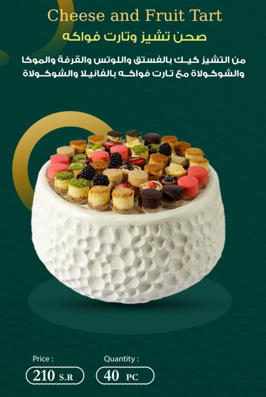 التشيز كيك بالفستق واللوتس والقرفة والموكا والشوكولاة مع تارت فواكه بالفانيلا والشوكولاة – عدد 40 قطعة.