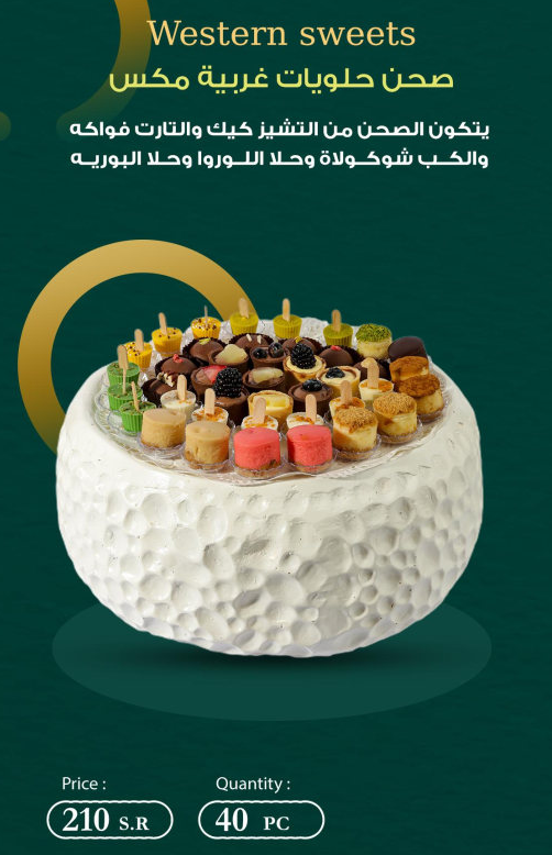 يتكون الصحن من التشيز كيك، التارت، فواكه، كب شوكولاتة، حلا اللوروا، حلا البوريه – 40 قطعة.